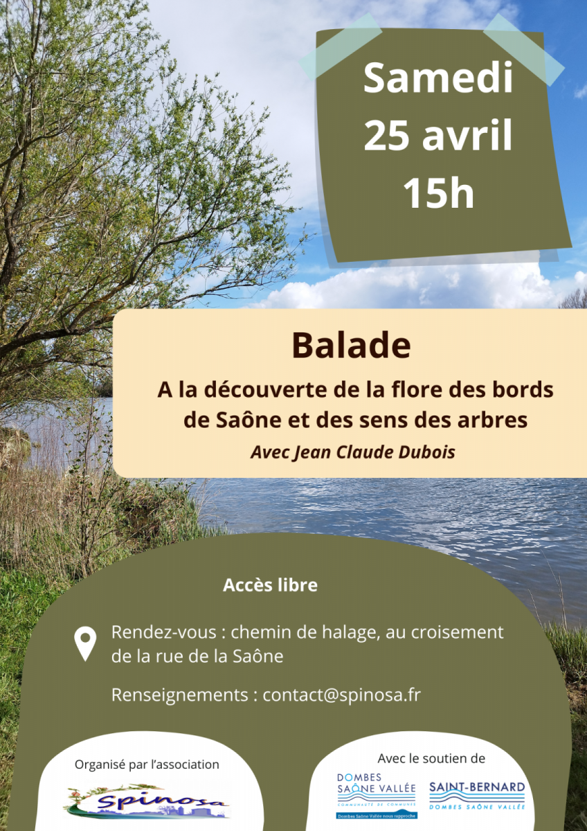 Avec l'association Spinosa, venez découvrir la flore des bords de Saône entre Saint Bernard et Trévoux. Le botaniste Jean-Claude Dubois vous accompagnera tout au long de cette balade et vous dévoilera les secrets des sens des arbres.